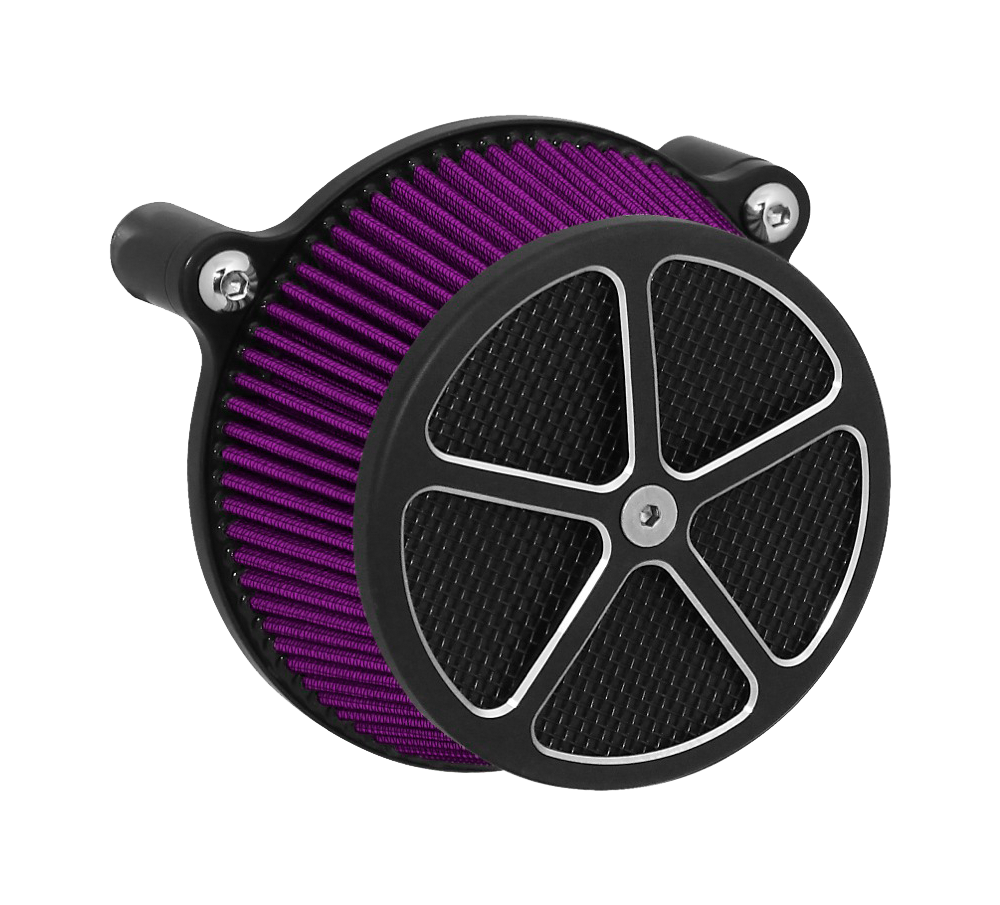 Performance and affordability are what make this a top selling air cleaner. Features include a billet aluminum back plate which provides better strength – eliminating broken, cast back plates that plague similar setups. Machined into each back plate sits a recessed pocket that encapsulates the performance air filter base, minimizing the unsightly look of the air filter base. The performance filter measures 2.75” deep, providing ample clean air to the oversized radius inlet. Head breathing is provided thru an internal passage in the back plate – providing a clean and practical solution. At the front of the air cleaner is the exclusive Wimmer Custom Cycle Air Star cover. Finely crafted and machined from a solid block of billet aluminum is your choice of a 3 or 5 spoke pattern. Beneath the billet cover lays the dutch woven stainless steel screen and plastic insert. Better Sucker with Air Star Cover kits are available in black powder coat, re-machined black, or show chrome. Five filter colors, stainless steel dutch woven screen, or black powder coat screen finish off the options.