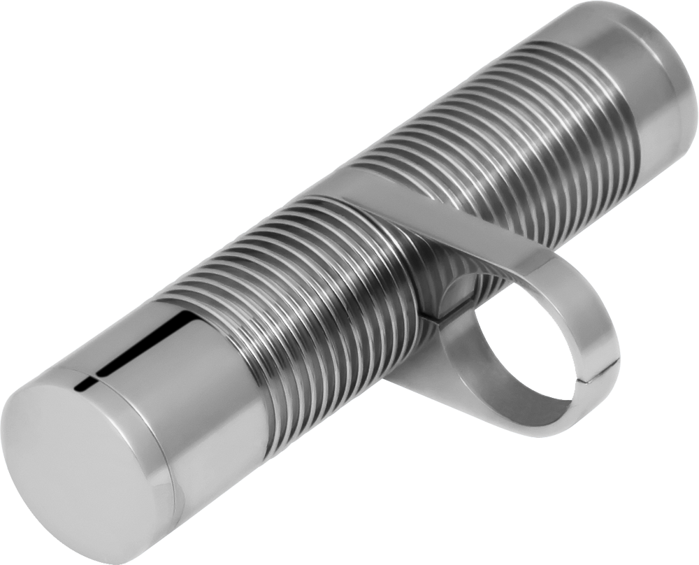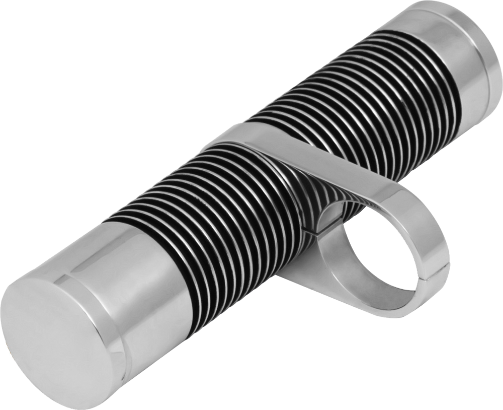 Wimmer Custom Cycle’s Single Tube Billet Stash Tube offers an attractive solution for small storage, or can be used to offer a balanced look for the front downtubes when a customer installs a matching oil cooler. Manufactured using the same rigorous process as our billet oil coolers the stash tubes are only different by the absence of the plumbing hardware which make the oil coolers functional. Frame clamps’ are available in various sizes ranging from one inch all the way up to and including two inches. The single tube billet stash tubes are available in four different finishes: show chrome, show polish, black with polished fins, or all black.